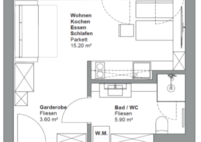 1 Küche/Essen/Wohnen/Schlafen • 1 Bad/WC • 1 Vorraum